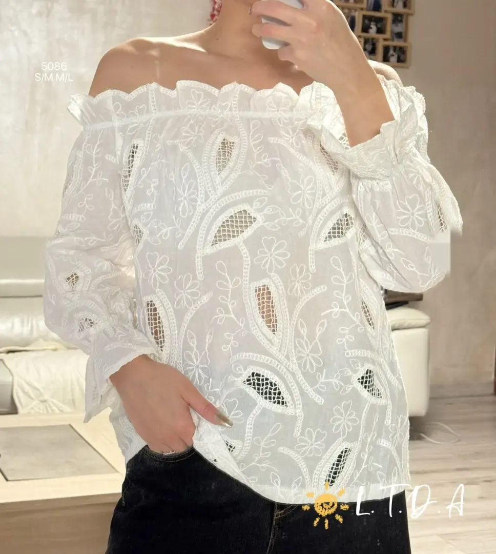 Blusa femenina en blanco, confeccionada en tela tipo encaje/bordado con diseño calado floral y detalles geométricos. Presenta escote bardot (hombros descubiertos) con elástico fruncido que aporta ajuste y un efecto romántico.