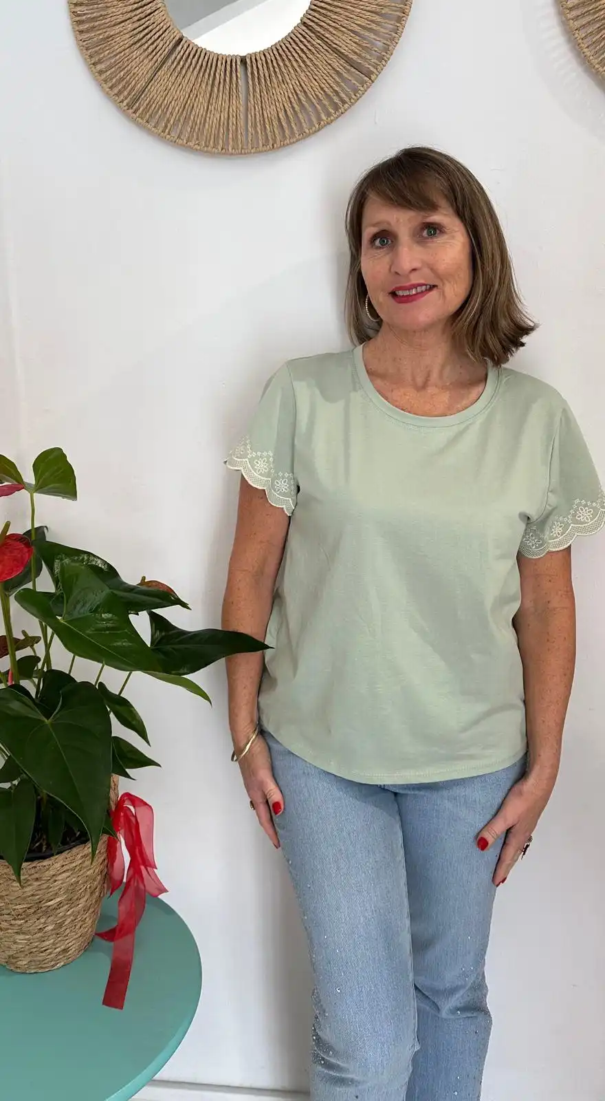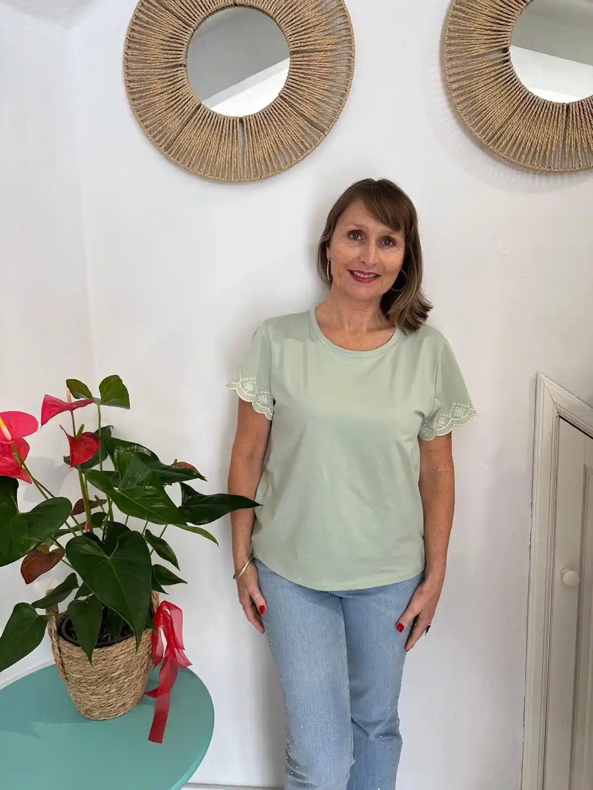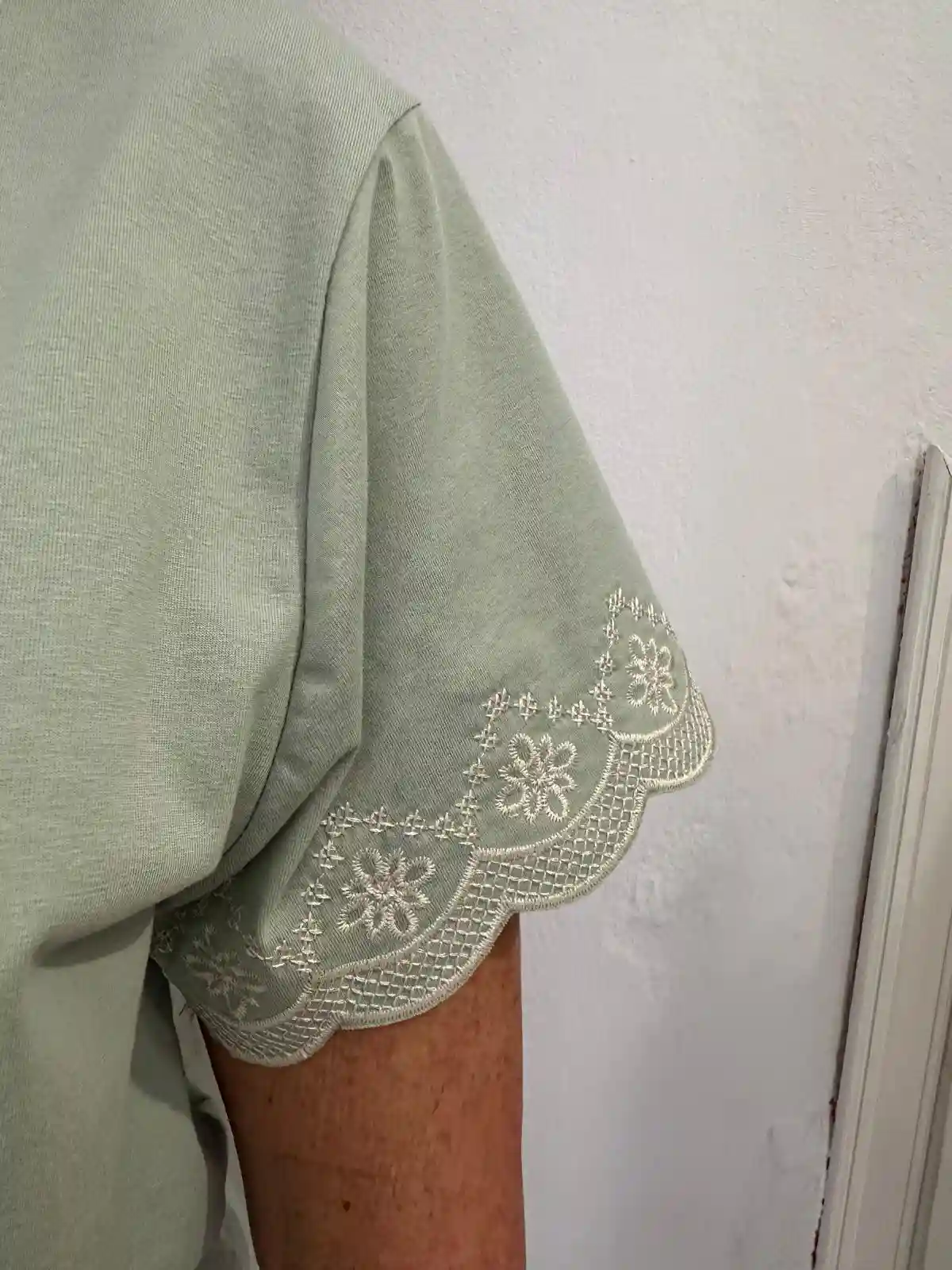 Camiseta de estilo básico y corte recto, confeccionada en tejido suave y ligero que aporta comodidad durante todo el día. Presenta cuello redondo y manga corta con delicado detalle bordado en el acabado, que añade un toque femenino y elegante. Su diseño versátil la convierte en una prenda ideal para combinar con jeans, pantalones o faldas, perfecta tanto para looks casuales como más cuidados.