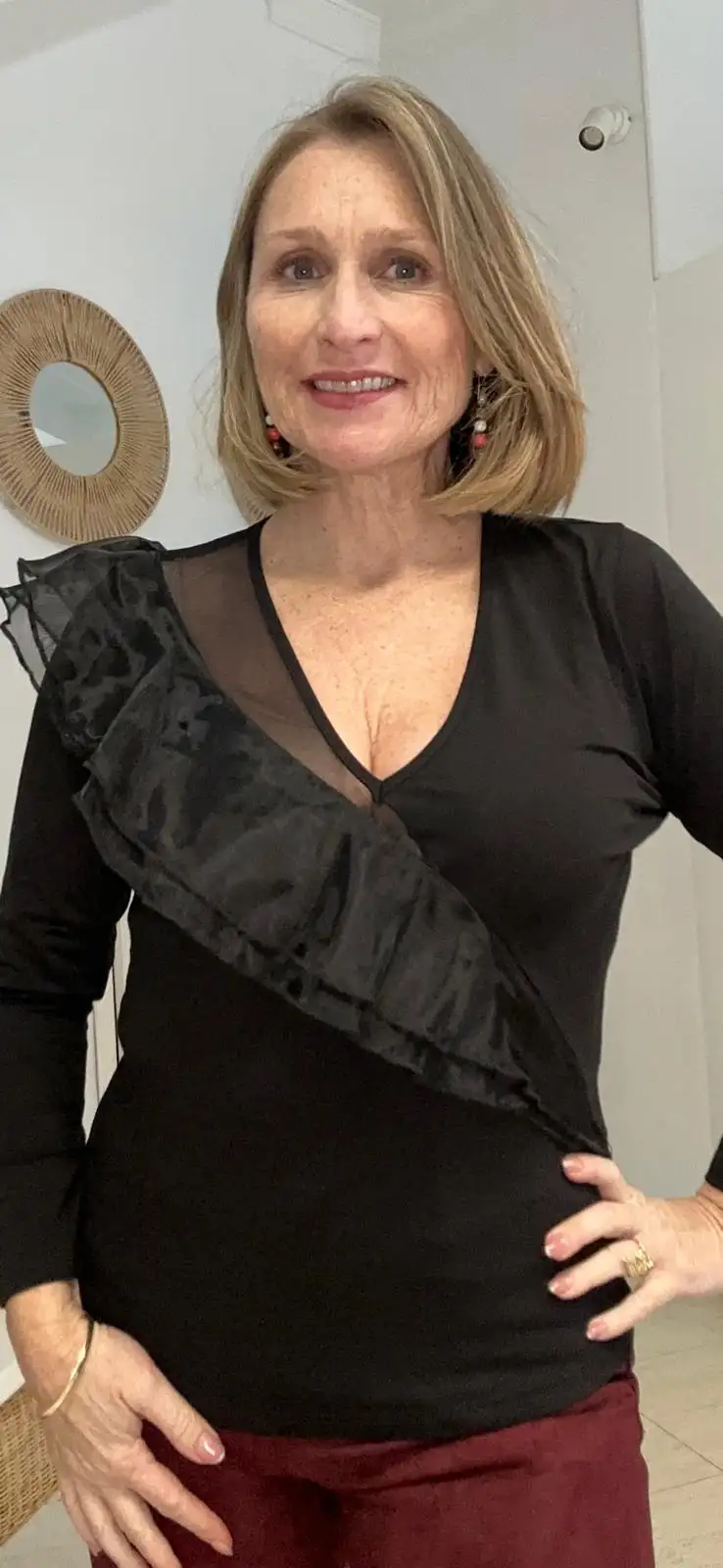 Top negro de corte ajustado con escote en pico y elegante transparencia en tul. Destaca su volante diagonal en tejido.