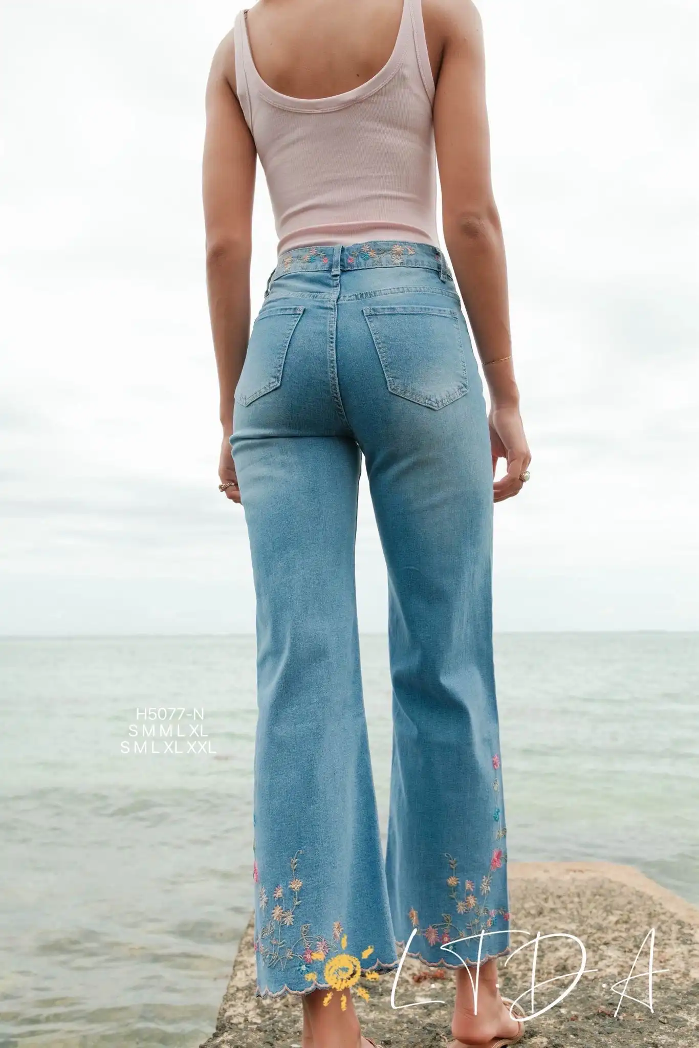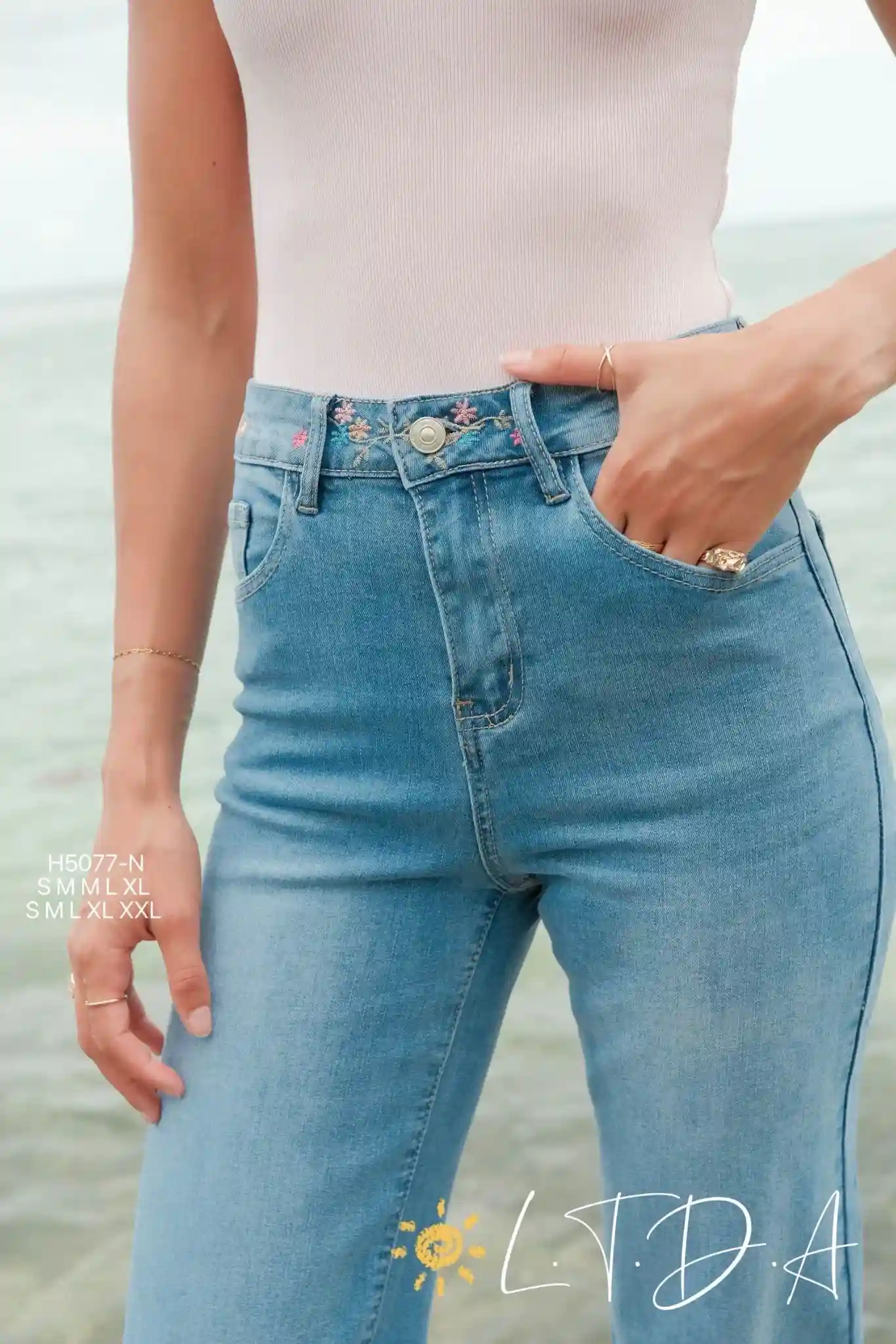 Vaquero de tiro alto en denim azul claro, con pierna ancha y largo cropped (a la altura del tobillo). Destaca por su bordado floral multicolor en la parte baja de las piernas y en la cintura. Es un bajo festoneado, que le da un aire femenino y veraniego. Tiene corte recto y fluido.