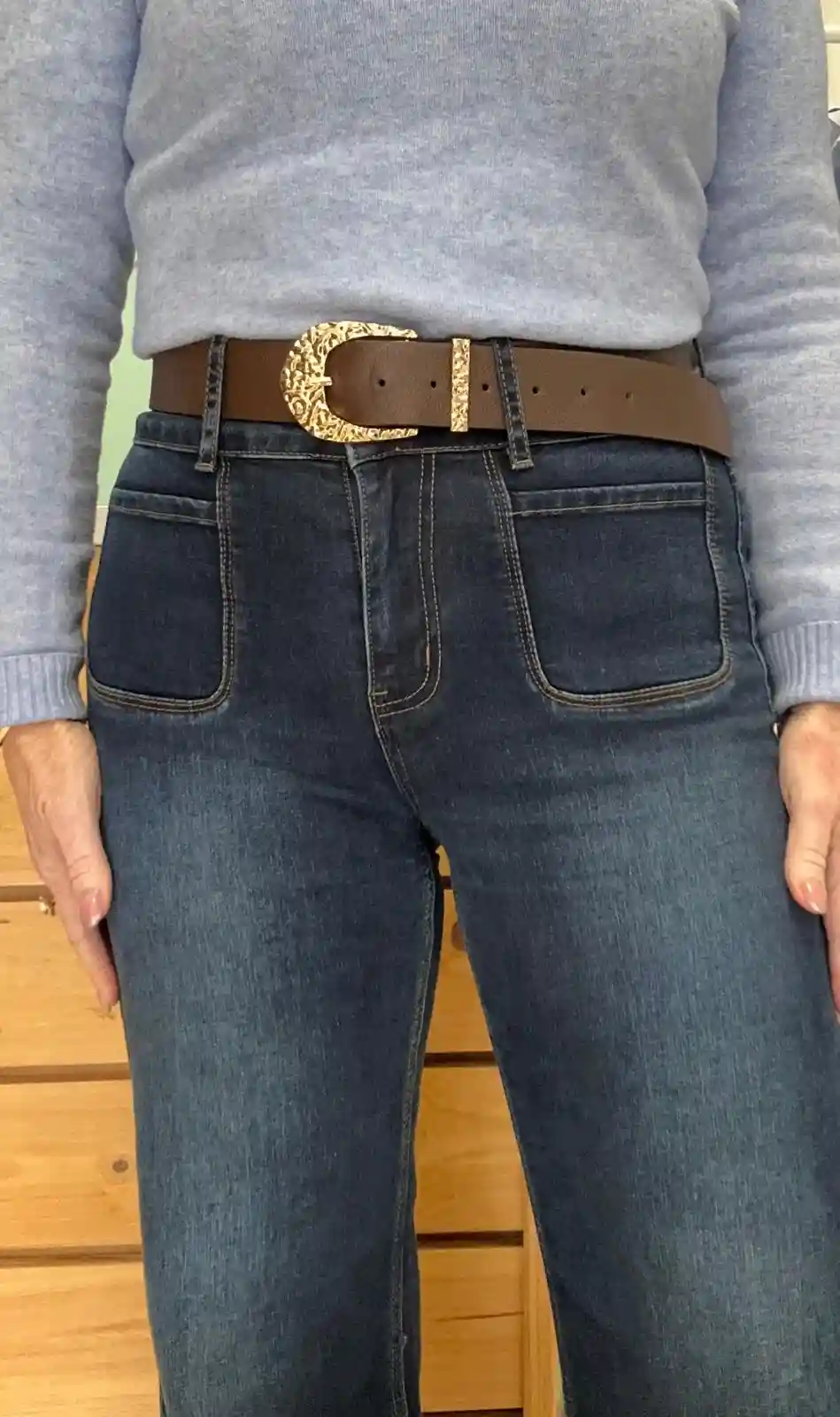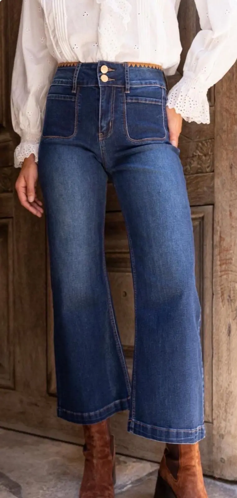 Vaquero de tiro alto, en denim azul oscuro. Tiene pierna recta tirando a ancha y bolsillos delanteros grandes, de estilo parche. Incorpora un detalle decorativa en la cintura, un bordado en color camel.