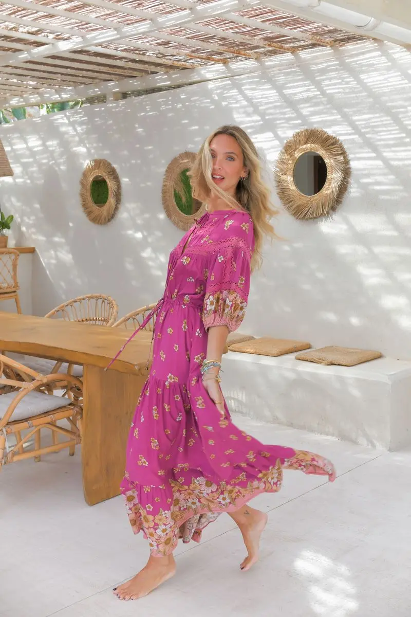Vestido largo de color fucsia vibrante con estampado floral romántico.