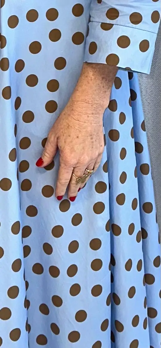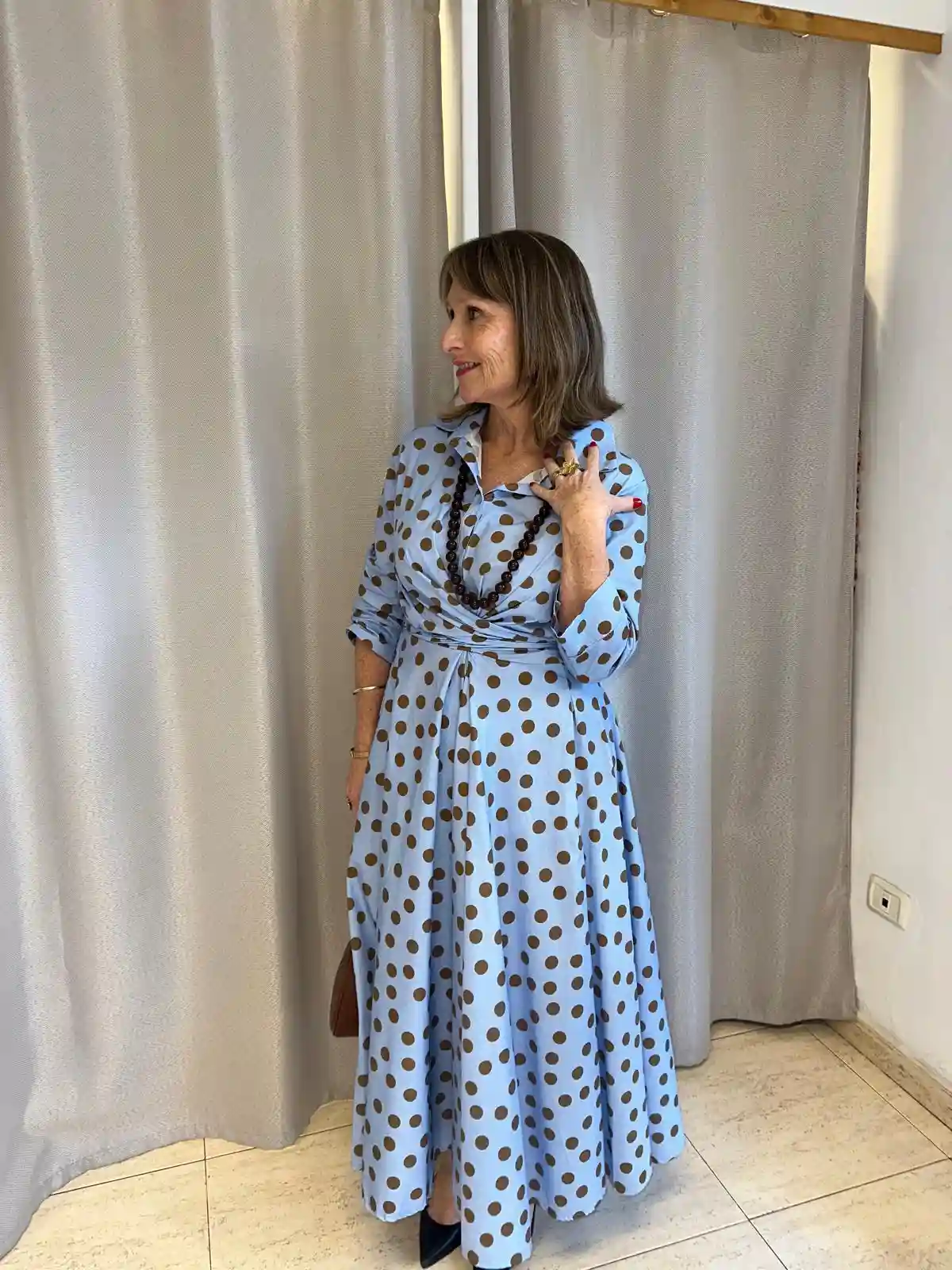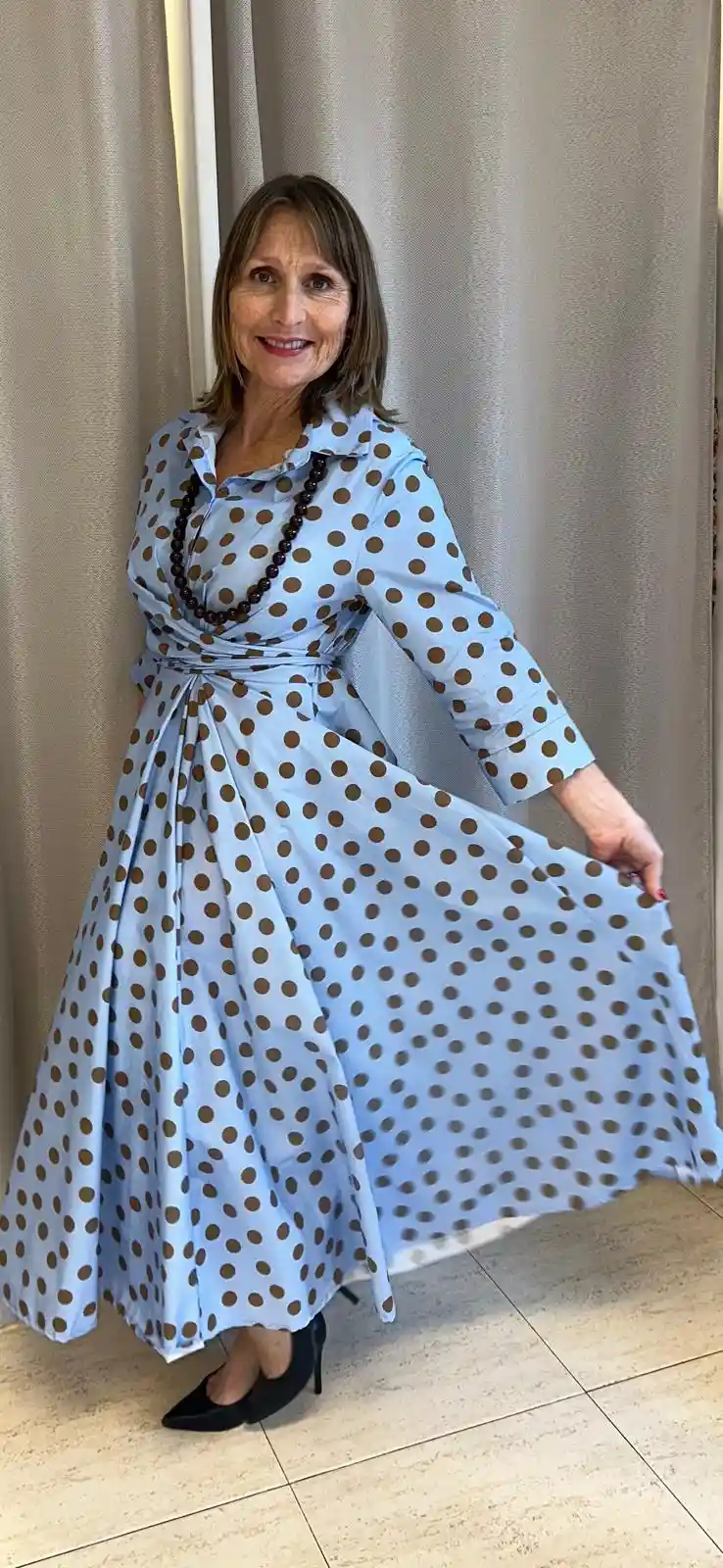 Vestido midi en color azul cielo vibrante con lunares en color cafe.La falda con vuelo de gran amplitud aporta un movimiento espectacular al caminar, dándole un aire regio y femenino a cada paso.