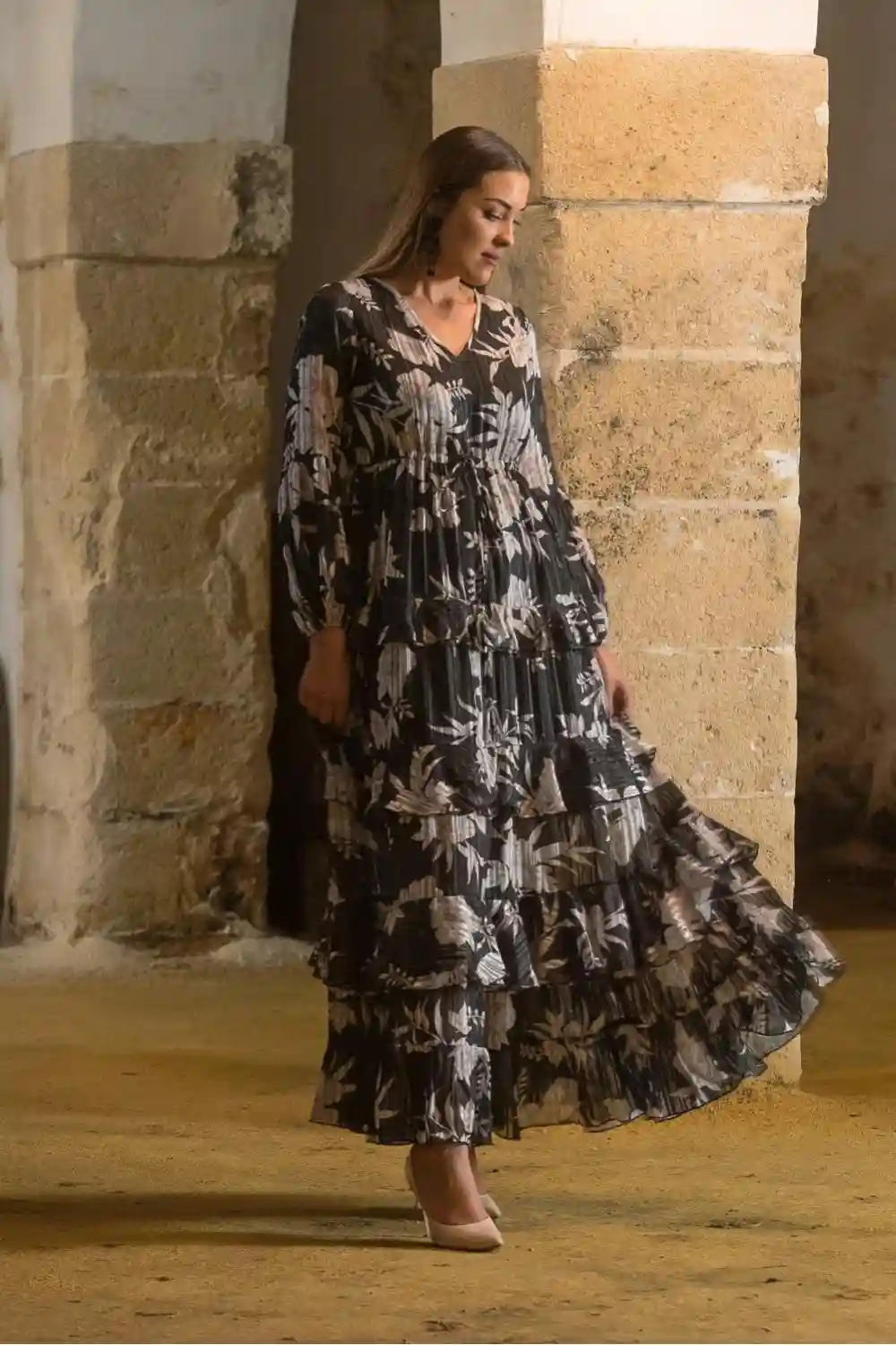 Vestido largo estampado Ramo negro con flores beige, escote pico, mangas largas abullonadas, cintura fruncida y falda volantitos