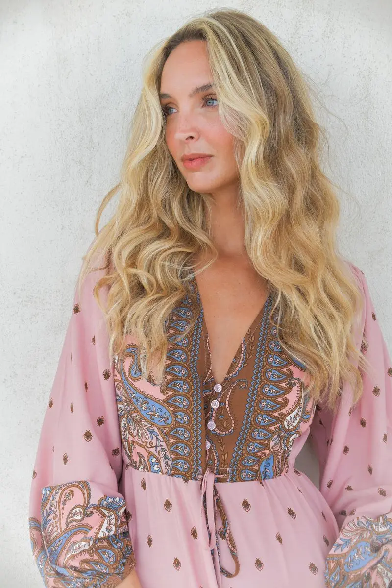 Vestido largo estilo bohemio en tono rosa suave, confeccionado en tela ligera y fluida que aporta movimiento y frescura. Presenta un escote en V con detalle de cordones ajustables y bordados decorativos en el pecho, combinando colores y patrones de inspiración étnica. Las mangas son largas y ligeramente abullonadas, con terminaciones estampadas que armonizan con el diseño inferior.